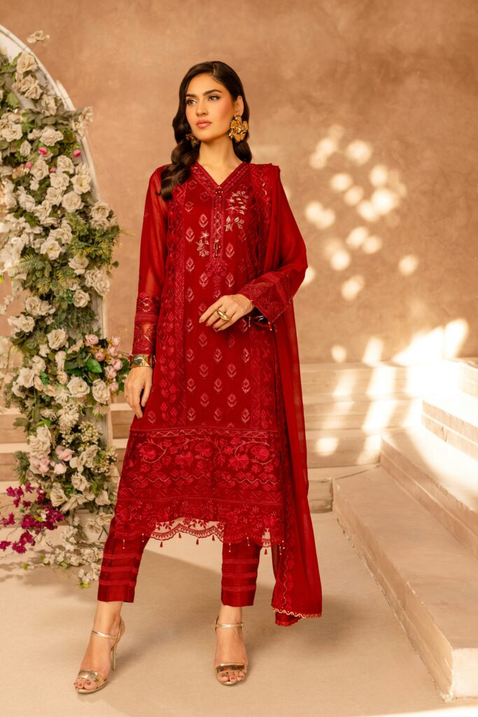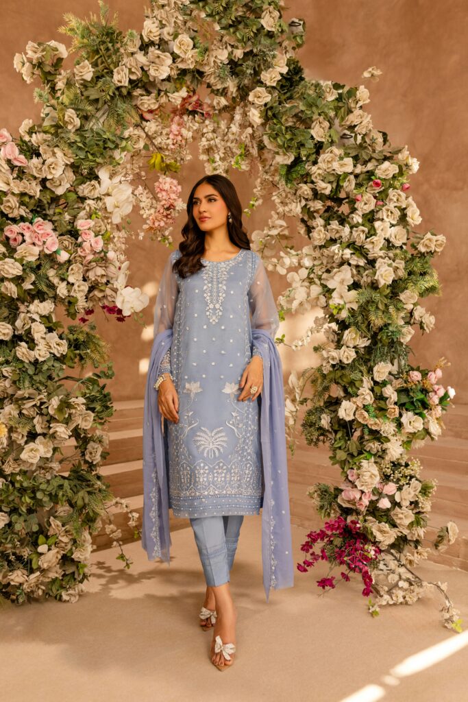 Fashion model in embroidered blue salwar kameez posing in Lahore, Pakistan.